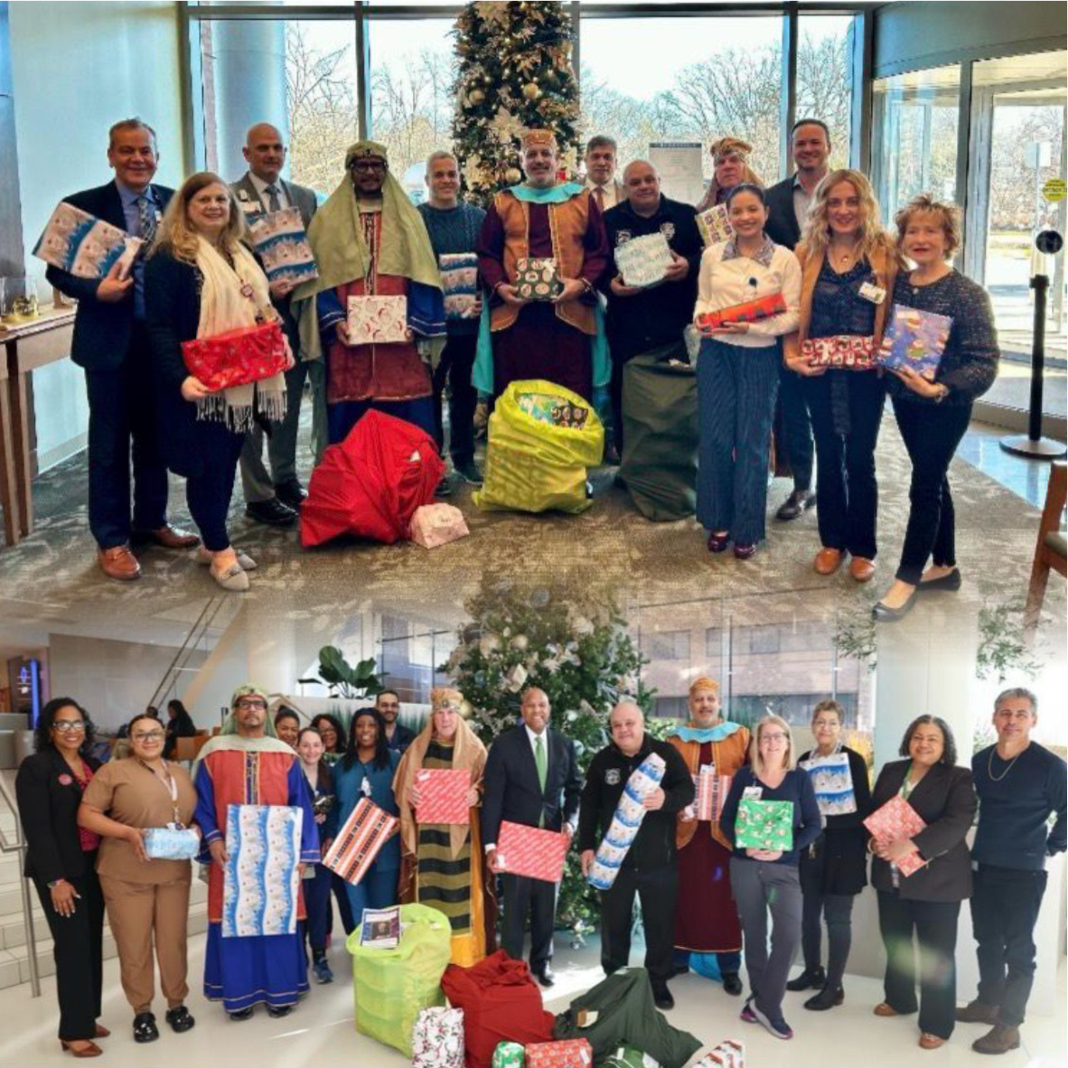 Newark, Luis Quintana y Aníbal Ramos, Jr., acompañados por los Tres Reyes Magos, junto con miembros del personal del hospital, incluyendo al director administrativo Thomas Burke, al director de peraciones Jordan A. Solop, al director médico Frank Dos Santos, DO, al director de recursos humanos Alfred Torres y otros miembros del personal.